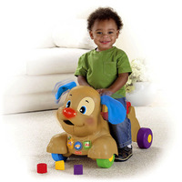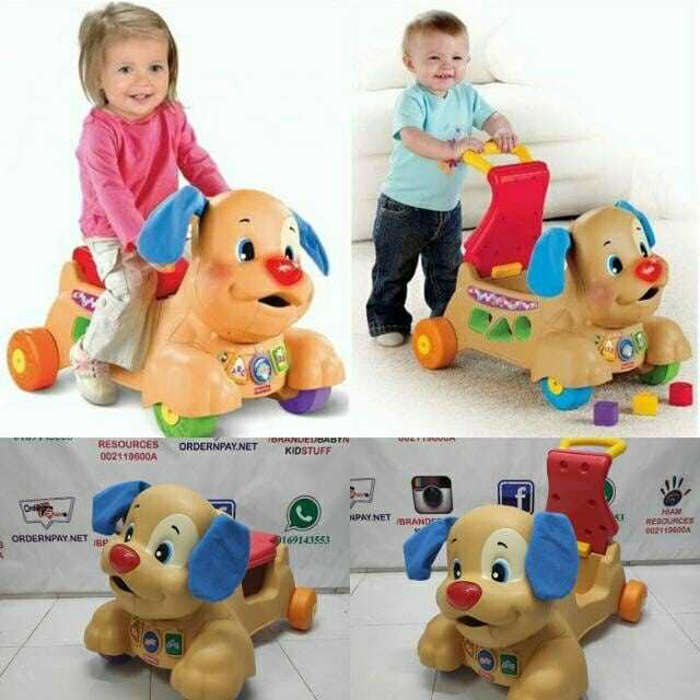 Laugh & Learn™ Stride-to-Ride™ Puppy - MATTEL & FISHER-PRICE ... The Stride-to-Ride Puppy, featuring the adorable Laugh and Learn puppy character, provides interactive play and physical developmental benefits for baby. The walker features an adorable moving head, flapping ears, and a moveable jaw so that baby can "feed" puppy. There is also a shape-sorting feature along the side for additional play.